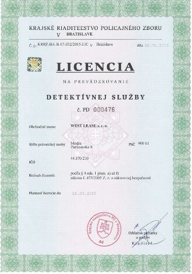 Certifikáty - Súkromný detektív | WEST LEASE s.r.o.